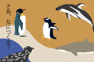 登別マリンパークニクスの人気者の、ジェンツーペンギン、キングペンギンに、シロワニ、カマイルカ、ゼニガタアザラシのペーパークラフトを学生といっしょにたのしく作るワークショップです。また、ジェンツーペンギン、キングペンギンのお面もあります!