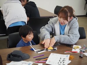 今回のワークショップでは、4月に入学した1年生のKDPメンバー5人も参加しまして、はじめての参加にわくわくドキドキしながらでしたが、すぐにそのたのしい雰囲気にも馴染んできて、子どもたちとの工作をたのしんでいるようすでした。