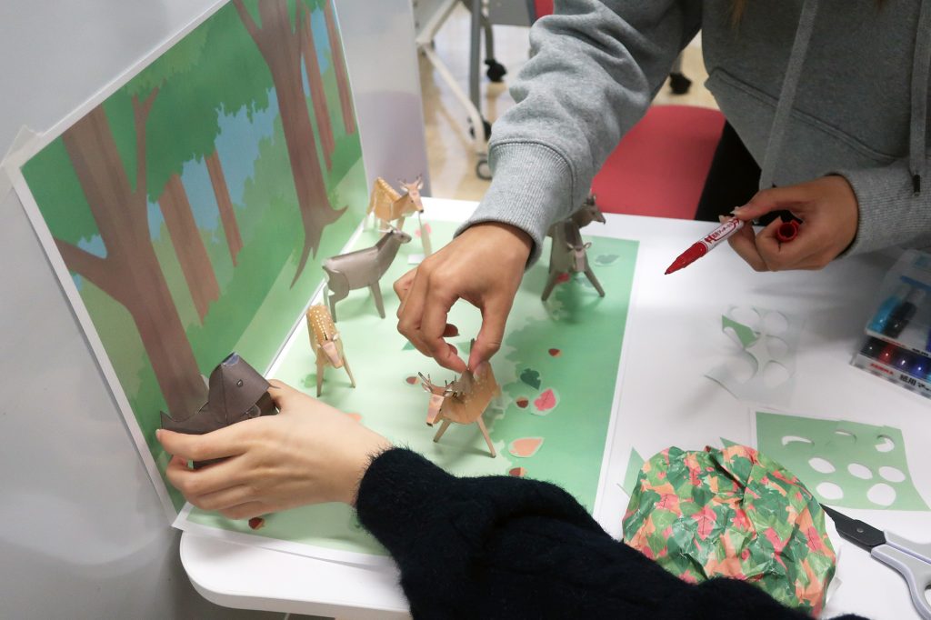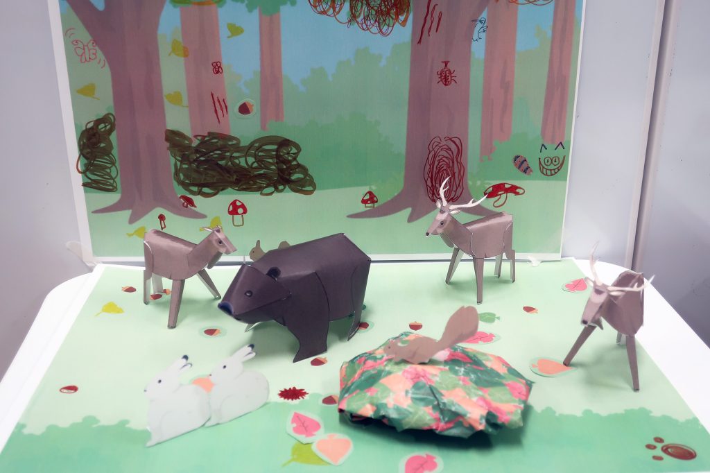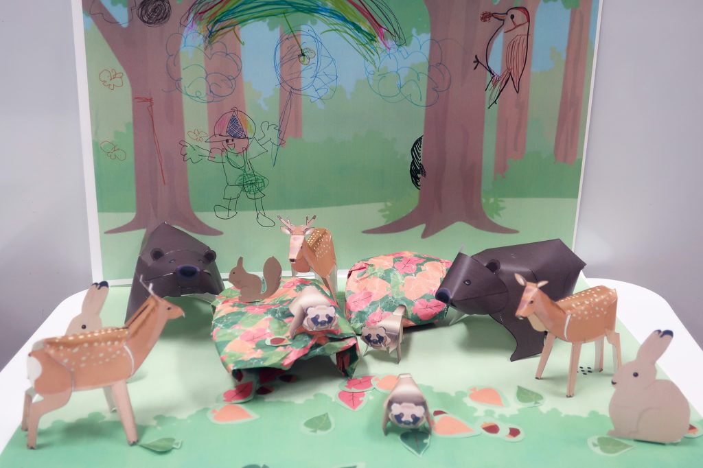 エゾヒグマやエゾタヌキ、エゾシカなどの森に棲むどさんこの生き物たちのペーパークラフトを作り、それを森の背景の中に置いてみながら森の生態系について考えてみるワークショップです。