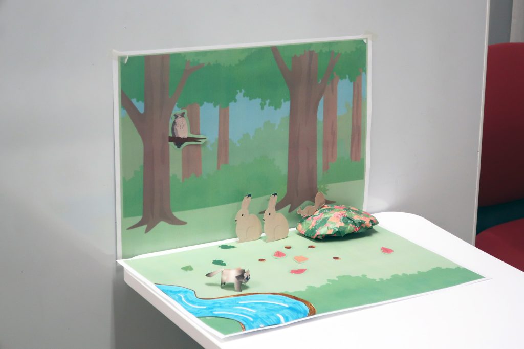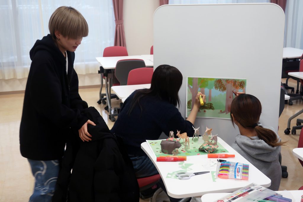 いくつもの生き物のペーパークラフトを作ったりにぎやかな森のようすを描いたりして、たのしくジオラマをつくることができるようにするために、簡単に作れるペーパークラフトの設計や、森のアイテムとしてどんなパーツを準備したらよいのかなどを、メンバーでたのしみながら試作してみました。